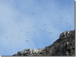 Những con chim biển bay lượn rợp trời, phần lớn là loài chim nông nâu California (California Brown Pelican).