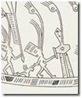Ta thấy rất rõ người cầm đèn có mũ hình vòm bán cầu có chỏm tròn hình bầu tròn như củ hành tây, một dạng bầu nậm nòng nọc (âm dương) càn khôn, vũ trụ (giống trang phục đầu người thứ 7 nhóm 7 người nhẩy múa trên trống Ngọc Lũ I: