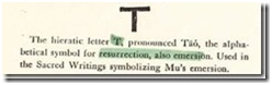 Theo James Churchward từ nọc chữ T có một nghĩa phục sinh, sống lại resurrection dùng trong các chữ viết biểu tượng của Lục Địa Mẹ Mu: