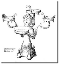 Cả người quì có hình nõ dương vật, đầu hình qui đầu, hai đùi mang hình ảnh hai hòn ngọc phái nam. Người nõ, dương vật, mặt trời là người hệ mặt trời thái dương giống như người Đông Sơn thấy trên trống Ngọc Lũ I. Đây chính là Người Việt Mặt Trời Thái Dương. Ta cũng thấy phần quì thân dưới có hình vuông có thể diễn đạt nường yoni vuông. Cả người mang hình ảnh linga-yoni của linga-shiva lưỡng tính phái Shiva. Nhìn riêng rẽ thì tay cầm đĩa đèn tròn diễn đạt nường, lỗ âm hộ. Người nõ và đèn diễn đạt nõ nường, nòng nọc (âm dương) ứng với lưỡng nghi, lưỡng cực. Bốn tượng người ở vai và hai nhánh đèn ở trên diễn đạt tứ tượng dương và bốn người ở dưới đùi diễn đạt tứ tượng âm. Tứ tượng dương và âm liên tác sinh ra tam thế. Ba nhánh đèn diễn đạt tam thế vũ trụ hay ba cõi thế gian. Hai nhánh hai bên có đĩa đèn hình chim. Tổng quát chim biểu tượng cõi trên, cõi trời. Nhìn theo nòng nọc (âm dương), theo duy dương chim biểu tượng cho dương, nõ, linga. Ở hình phục chế hai con chim trông giống nhau. Không chắc có đúng không? (vì là phục chế lại).