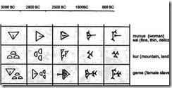 -Hàng thứ nhất: hình vẽ bộ phận sinh dục nữ tam giác ngược (3.000 Trước Dương Lịch) tiến hóa tới năm 600 Trước Dương Lịch thành chữ nêm chỉ đàn bà munus (lưu ý munus có mu- cùng âm với Việt ngữ mụ).